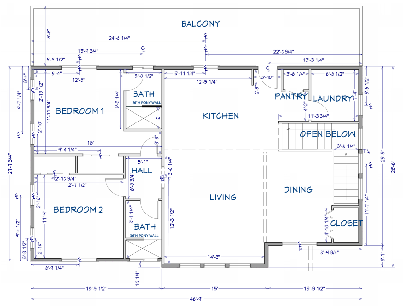 1200sf living space over 1500sf garage below. Conventional wood framed with roof trusses and long span glulam floor beams.